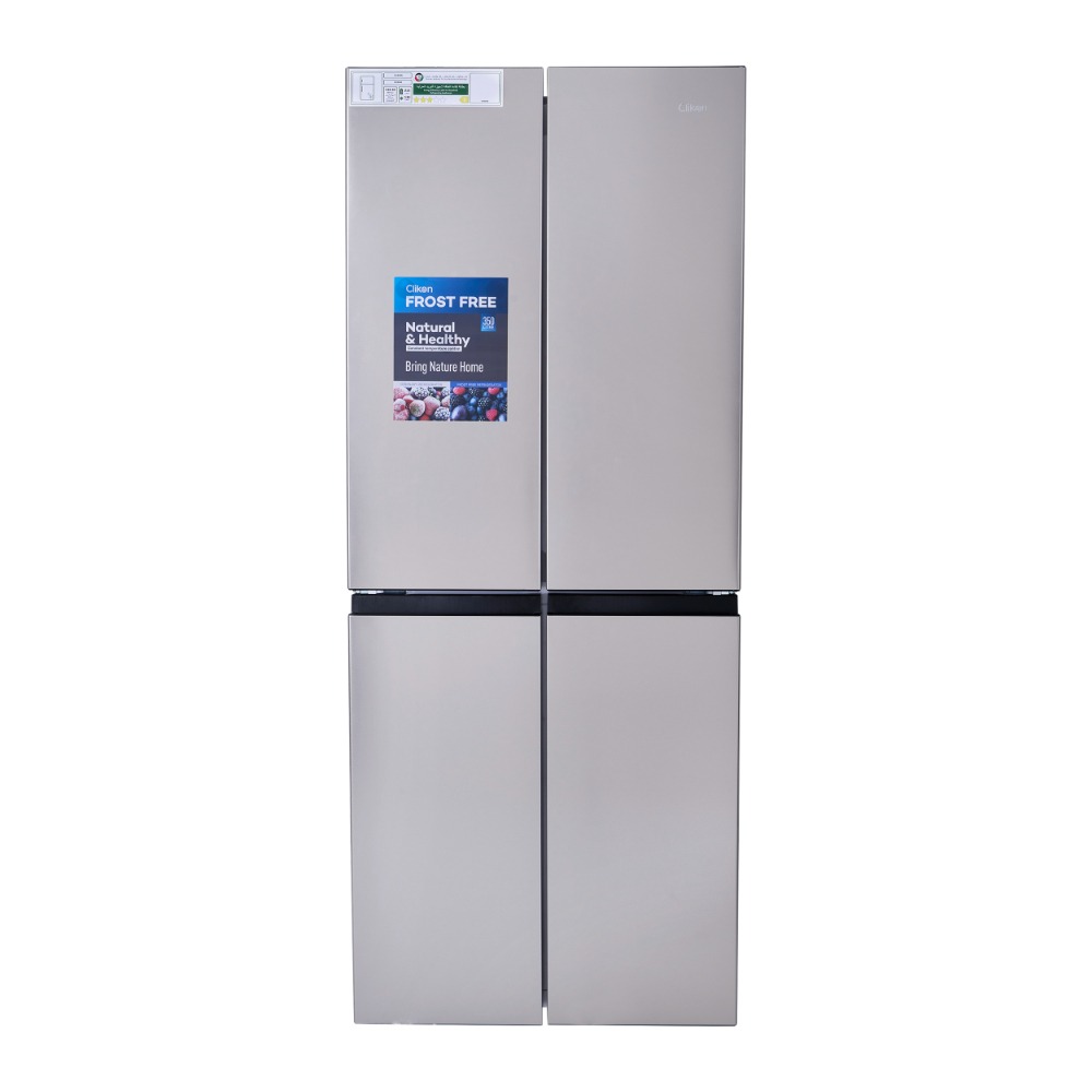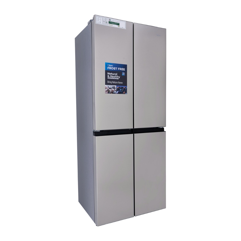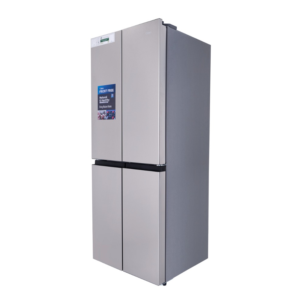 The French Four-Door Bottom Freezer Refrigerator is a spacious and energy-efficient appliance, offering a gross capacity of 350 liters and a net capacity of 343 liters. The refrigerator is designed to provide ample storage space with a fresh food compartment capacity of 213 liters, while the freezer section holds 130 liters, ensuring sufficient room for both refrigerated and frozen items. It features a no-frost system, eliminating the need for manual defrosting and keeping your food fresh without the build-up of ice.The refrigerator is equipped with an interior light for easy visibility, allowing you to locate items quickly even in low-light conditions. Additionally, it includes a lock and key feature for added security. The unit uses the eco-friendly R600a refrigerant, which helps in reducing environmental impact while maintaining cooling efficiency. With a noise level of 42dB(A), the refrigerator operates quietly, ensuring a peaceful environment in your kitchen. Its low power consumption of 518.30 kWh per year makes it energy-efficient, helping you save on electricity bills while keeping your food fresh.